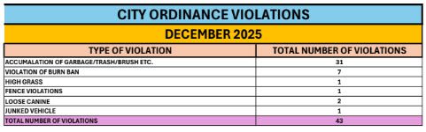 December 2025 City Ordinance Violations